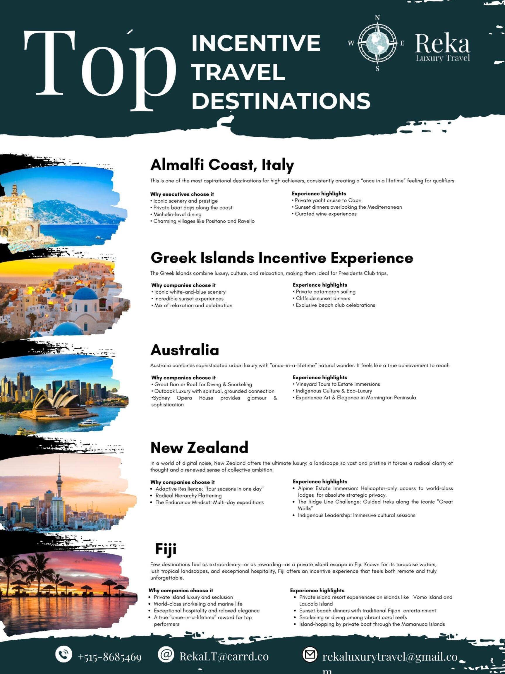 Reka Luxury Travel partners with privately held firms to design and manage performance-aligned incentive travel experiences. Engagements include strategic program design, supplier negotiation, and full-service execution.